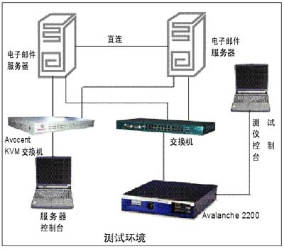 测试工具采用思博伦通信(Spirent Communications)公司提供的Avalanche 2200。Avalanche 2200模拟实际的用户发出向服务器的请求(包括SMTP和POP3),并根据回应给出具体的详细测试结果。它有以下特点:能够模拟成百上千的客户端对服务器发出请求;能够模拟真实的网络应用情况;可以产生20000个连接/秒请求量,足以满足测试的需要。