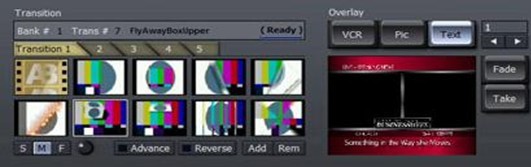 Overlay是字幕上屏控制区,Take是直接切入 / 出,Fade是淡入 / 出。