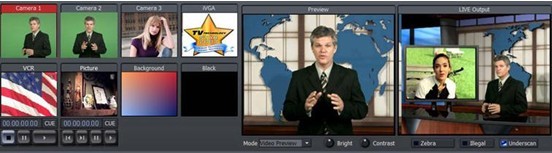 如上所视,这个区域可以同时监看三路Camera信号、一路VGA信号、一路VCR信号、一路Picture信号、一路Color Background颜色、一路Black信号和正在输出的Live信号。