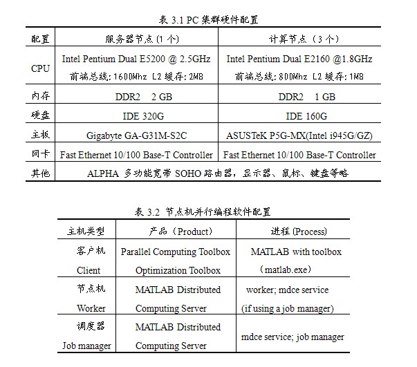 实验室内局域网所用机器均采用操作系统为WINDOWS XP SP2,快速以太网网卡10/100Mbps,通过路由器连接,并安装MATLABR2008b及相关工具箱,表3.1和表3.2分别给出了集群相关硬件配置和安装软件